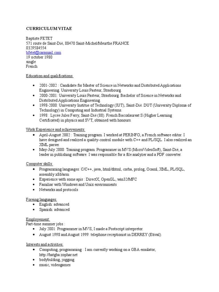 Its style should be brief and clear. Your resume is saved in your online account for you to access and update anytime, from anywhere. Rédigez un cv professionnel en 10 minutes seulement grâce à notre créateur de cv. A curriculum vitae, otherwise known as a cv or résumé, is a document used by individuals to communicate their work history, education and skill set. Our very own cv maker enables you to create credible documents that will be vital when attending interviews with recruiters.we focus on the design and framework so that all you have to do if write up your experiences and hit the job market with your wonderful cv's!. Edit your cv in just a few minutes with our online creation platform. Choose the best one for you. Introduire des données et télécharger votre cv instantanément au format pdf. Free downloadable curriculum vitae example in word format. You will first have to create your europass profile with information on your education, training, work experience and skills. Download your cv in pdf or txt format, in one click, and finally complete all of your projects. Unlike usual cvs, the following cv is organized in an excellent way, each section of the cv illustrates part of your profile with special colors and graphics. Right under the photo and contact details, there is a professional summary section.